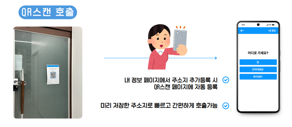 실제 서비스라고 가정한다면 병원이나 요양원, 공공장소 등에 QR을 붙여놓고 카메라로 스캔만 하면 해당 위치에서 바로 택시를 호출할 수 있게 해야한다고 생각했다.