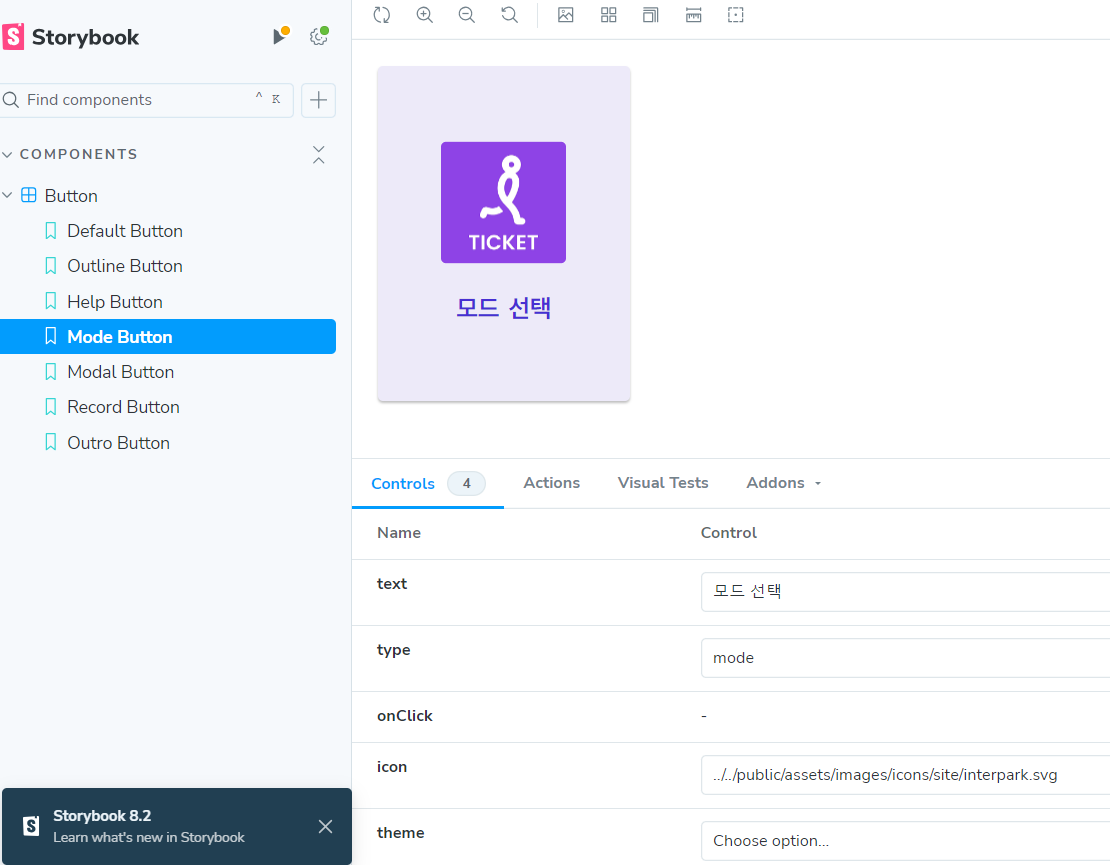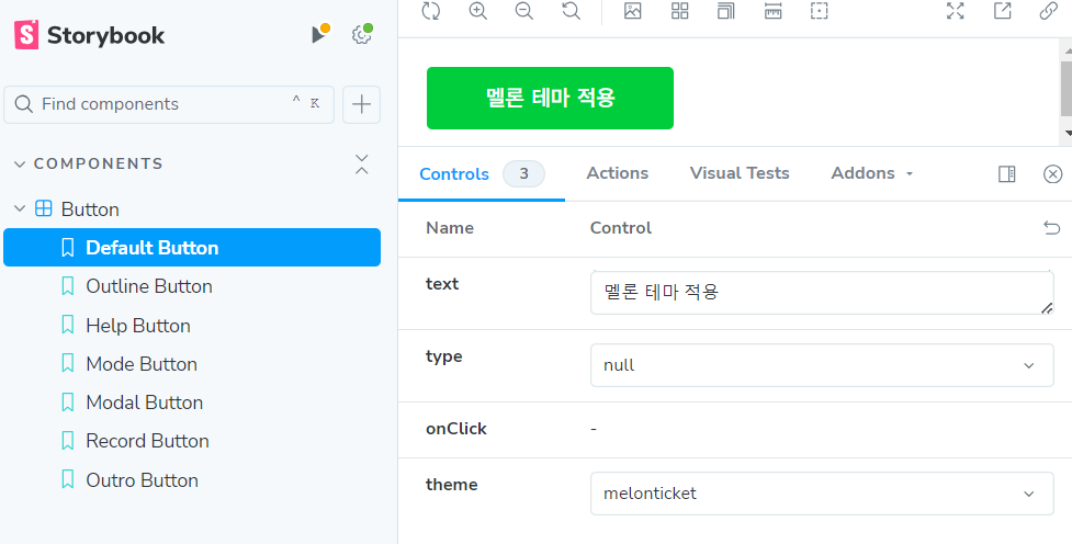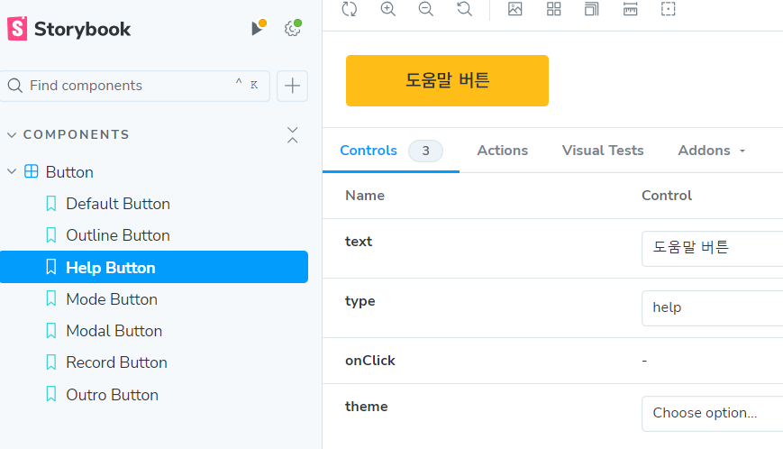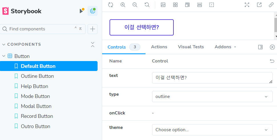 이렇게 설정하면 스토리북 구동 시 옵션을 선택해서 손 쉽게 버튼 타입을 바꿀 수 있다.