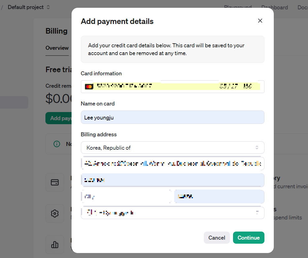 이렇게 카드 정보 및 개인 정보를 입력하고 최소 한도인 5달러로 설정했다.