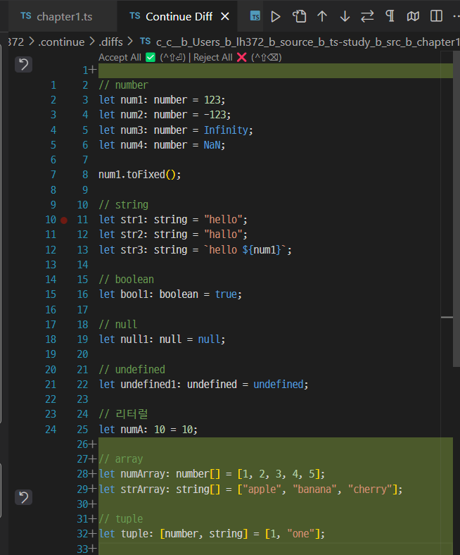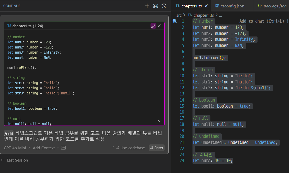 타입스크립트 공부용 파일에서 드래그 후 ctrl + l을 클릭해 이렇게 물어보았다.