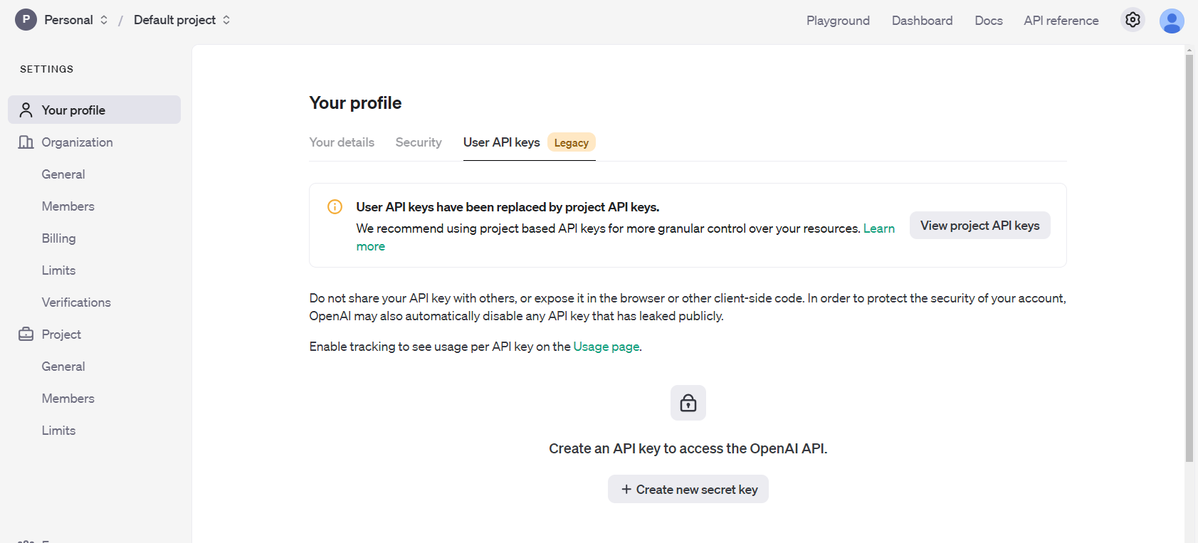 위 링크 openAI 사이트에서 Continue를 위한 새로운 프로젝트를 하나 만들었다.