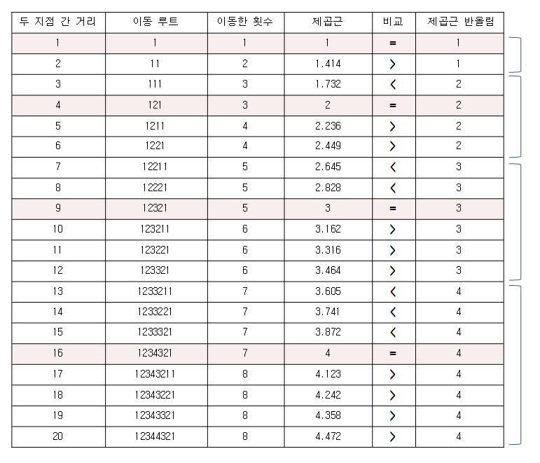 일단 처음과 마지막 이동횟수는 무조건 1이라는 정보는 명확하므로 이에 따라 거리를 늘려가면서 거리 당 이동 횟수를 노가다로 구해보며 수학적인 패턴을 찾는다.
