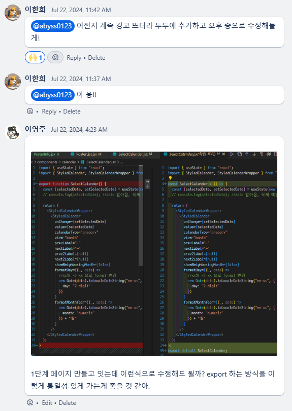 이 과정에서 styled-components와 css module을 사용한 컴포넌트 개별요소들을 전부 리팩토링해야했는데, 이때 제가 코로나에 걸려서 며칠동안 개발을 진행하지 못해서 다른 팀원 친구들이 수고를 많이 해주었습니다. 나중에 참여했을때는 이미 해당 부분 개발이 많이 진행된 상태였는데 PR도 너무 상세히 작성해주고, 모르는 부분이 생겨서 물어보았을때 정말 친절히 답변받았던 기억이 납니다. 친구들아 다시 한 번 정말 고마워..