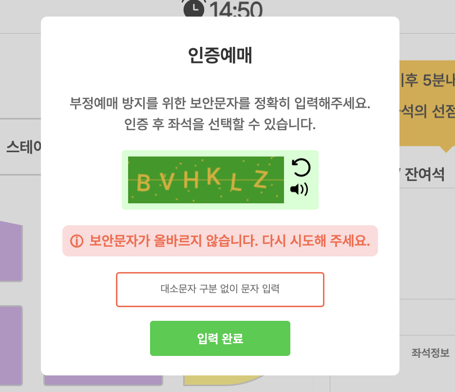 실제 티켓팅과 유사한 화면을 구현하여, 제한 시간 내에 티켓팅에 성공하도록 유도하는 모드입니다.