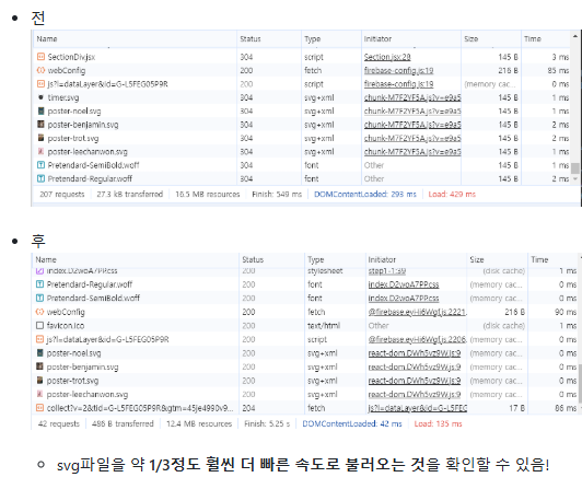 이 문제를 해결하기 위해 imagemin 라이브러리를 활용해 이미지 압축 유틸리티 함수를 만들어 서버에 적용했습니다. 또한, 이미 업로드된 이미지들은 동적인 변경사항이 없으면 1년간 캐싱되도록 설정하여 불필요한 서버 부하를 줄일 수 있도록 노력했습니다. 이러한 최적화를 통해 SVG 파일 로딩 속도를 30% 이상 개선하여 웹 브라우저 최적화에 대한 첫 걸음을 내딛었습니다. 팀원들도 이 문제를 해결한 것에 대하여 좋아해주어서 더욱 기뻤습니다!