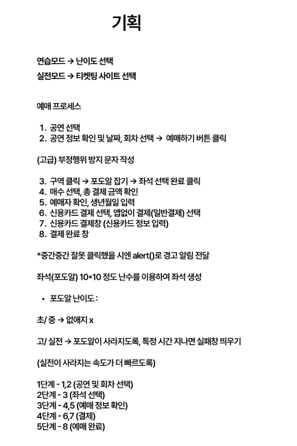 실전 감각을 익힐 수 있도록 4개의 티켓팅 예매 사이트)를 참고하여 디자인했습니다. (구현을 위해 참고한 티켓팅 사이트 목록: 인터파크티켓, 티켓링크, YES24, 멜론티켓)