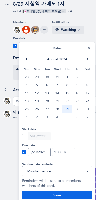 트렐로를 통해 회의 일정을 관리하는 것 뿐만 아니라, 리마인더 기능을 통해 회의 시작 전 알림을 보낼 수 있습니다. 또 pc버전 뿐만 아니라 App도 제공되기 때문에 회의 장소와 시간을 언제 어디서나 기억하기 편리했습니다. (특히 저희는 오프라인 만남 시 매번 장소가 바뀌는 편이라 더욱 필요한 기능이었습니다...!)