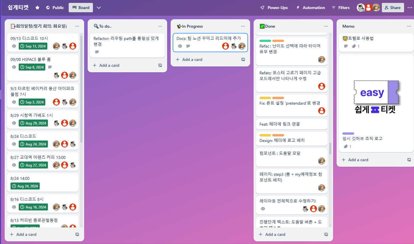 또한 Trello를 활용해 모임과 개발 일정을 관리하여 효율적으로 이슈를 해결하기 위해 노력했습니다!