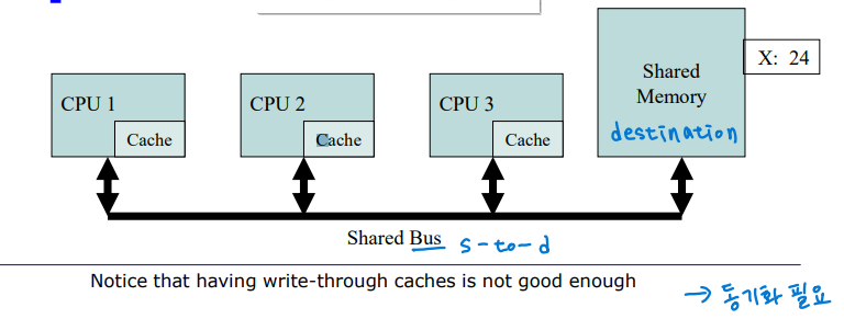 - 프로세서 1이 메모리 값을 변경하고, 프로세서 2는 구버전 값을 갖고 있을 수 있음.