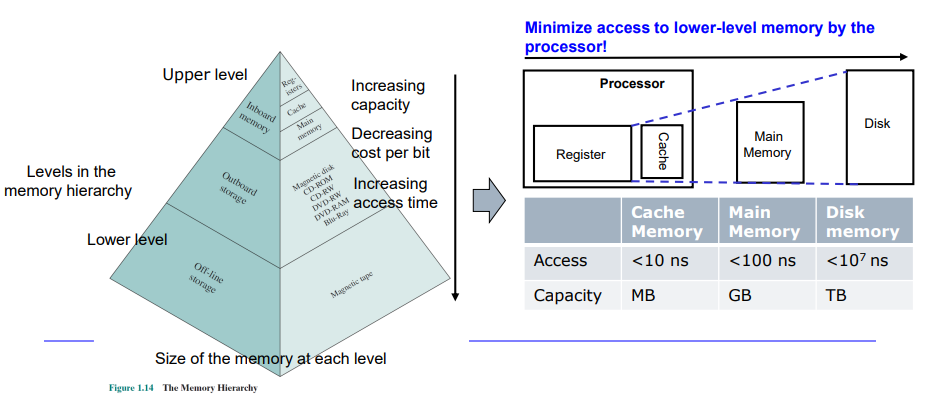 - 계층화: 작은, 빠른, 비싼 메모리는 크고 느린, 저렴한 메모리로 보충됨.