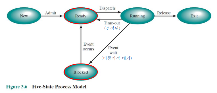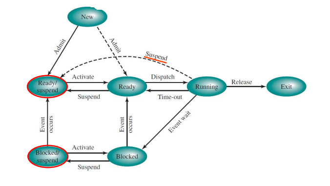 - Blocked/Suspend (블록/보류): 보조 메모리에서 이벤트 대기