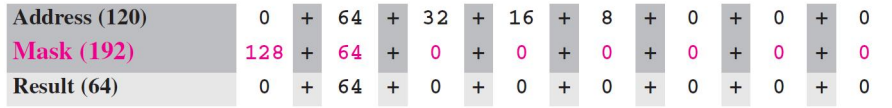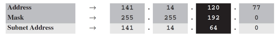 예제 5.19에서 클래스B의 네트워크를 4개로 분할했다. 그 중 subnet 2의 주소 중 하나가 141.14.120.77이므로 서브넷 주소는 다음과 같이 찾을 수 있다.