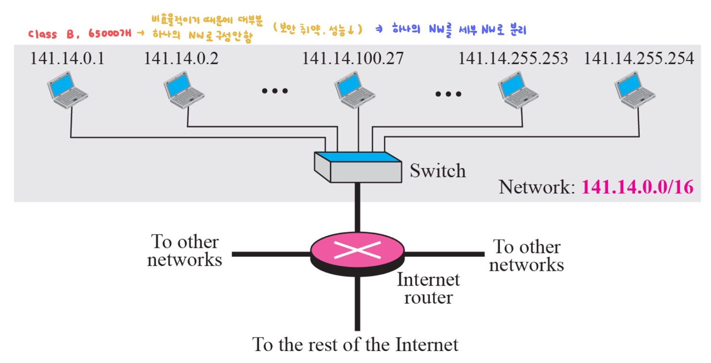 - 위 그림은 subnetting 전의 클래스 B 주소를 사용하는 네트워크를 보여준다.