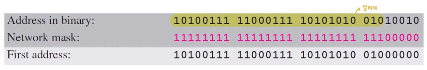 라우터는 목적지 주소 201.24.67.32의 패킷을 수신한다. 라우터가 패킷의 네트워크 주소를 찾는 방법은?
