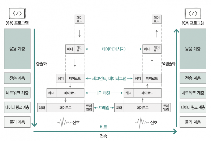 수신 호스트의 각 계층에서는 하위 계층으로부터 받은 데이터에 포함된 헤더 부분의 정보를 사용해서 해당 계층의 프로토콜을 처리한 후 헤더부분을 제거한 데이터를 상위 계층으로 넘깁니다.