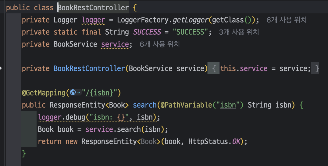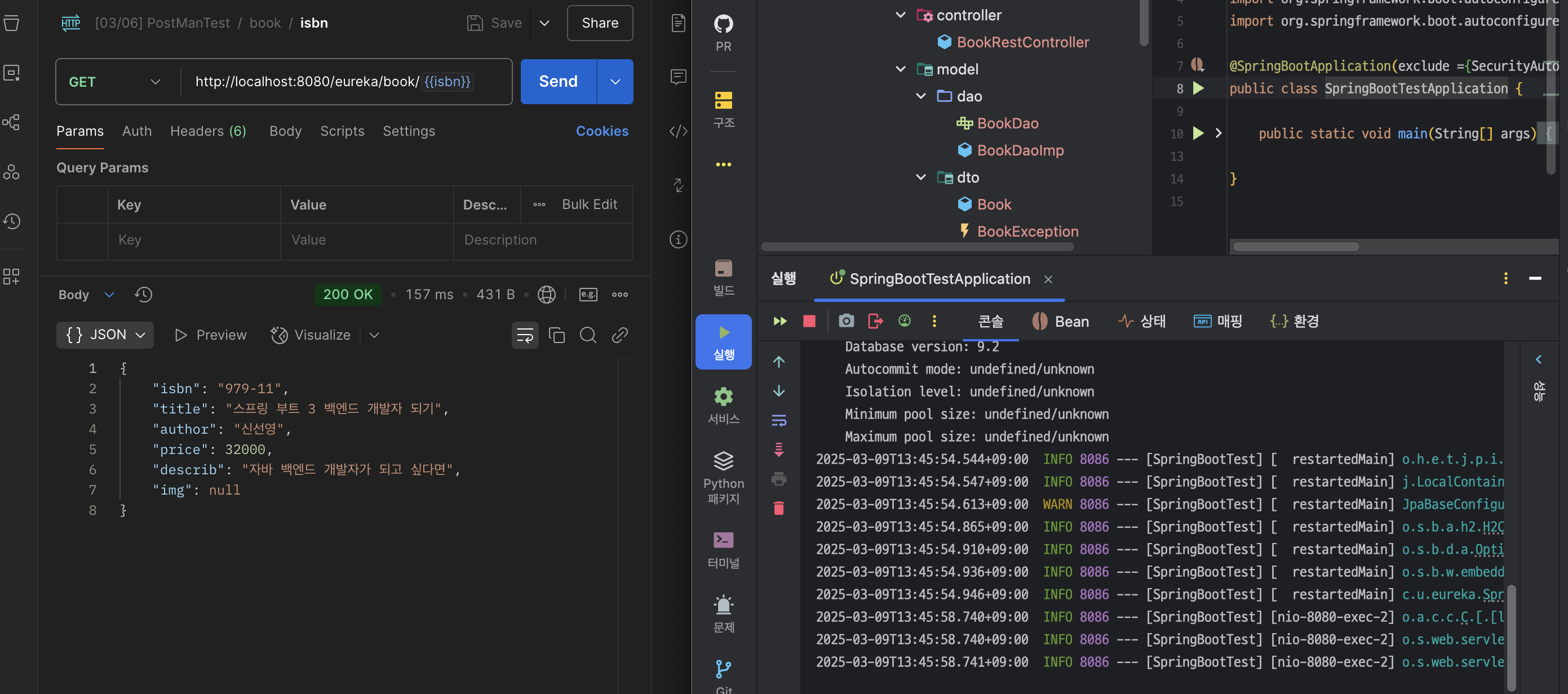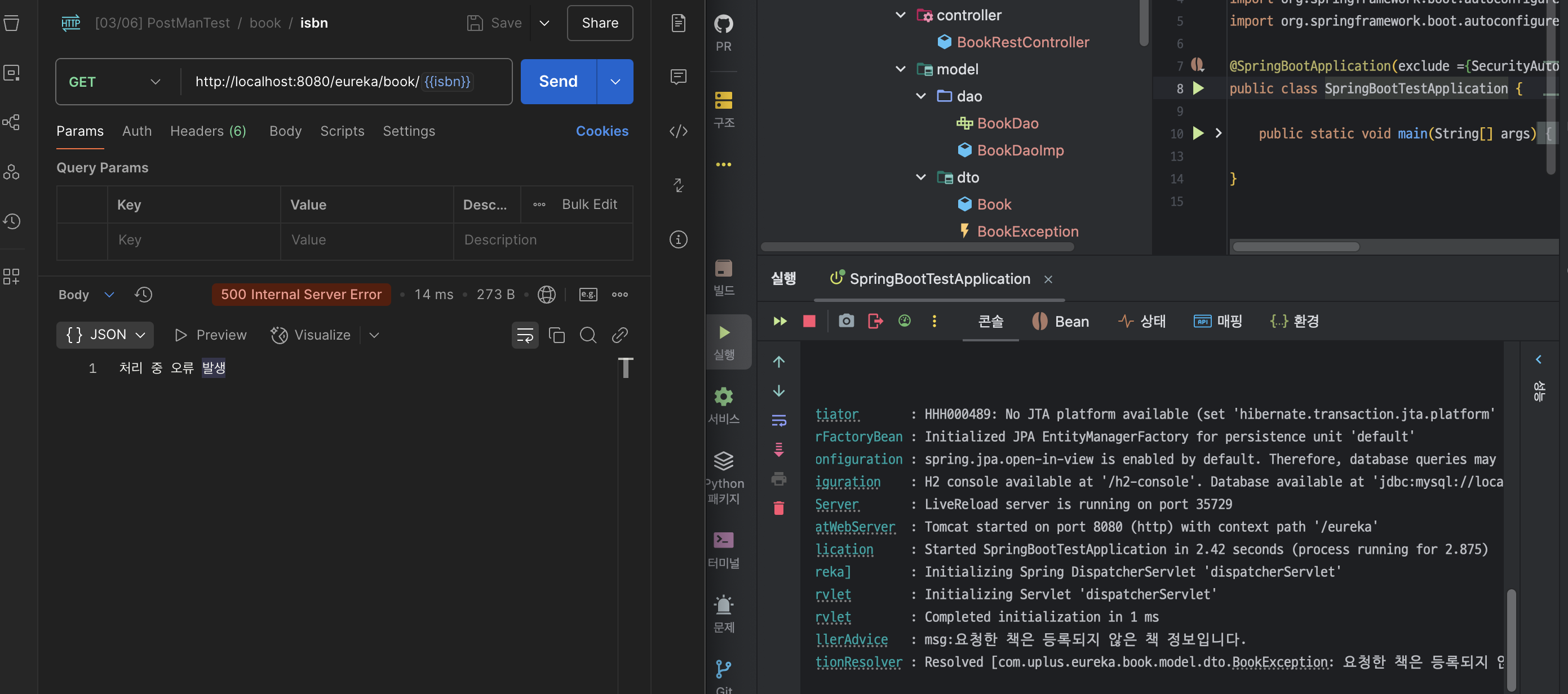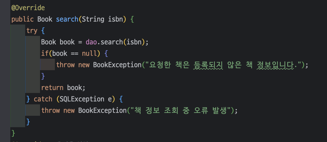 - 비즈니스 로직 처리 → 조회된 책이 없으면 BookException을 발생시켜 예외 처리