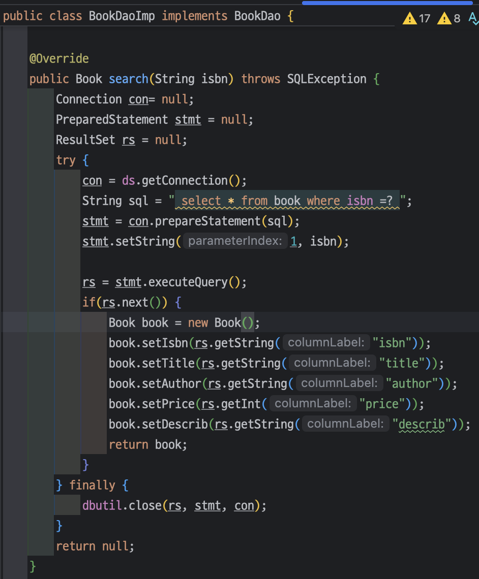 - DAO를 호출하여 데이터 조회 → dao.search(isbn)을 통해 DB에서 책 정보를 가져옴