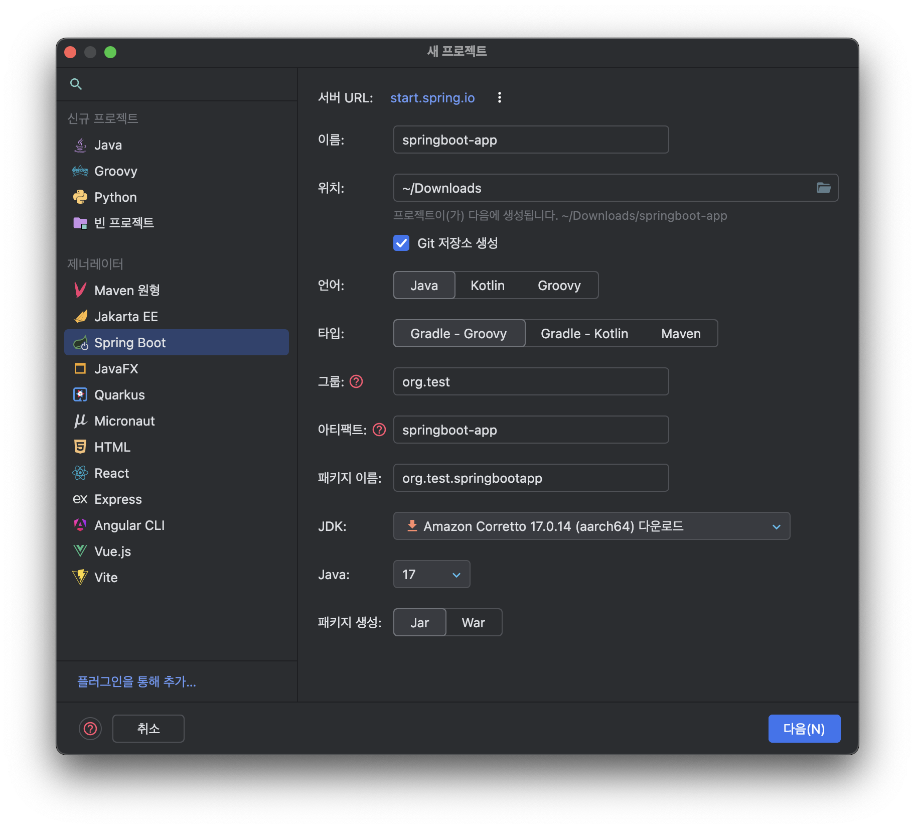 IntelliJ IDEA에서 새 프로젝트 생성 시 아래와 같이 설정합니다.