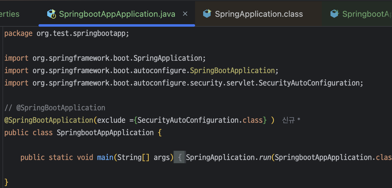 이는 Spring Security의 기본 설정 때문이므로, 이를 제외하기 위해 메인 함수 어노테이션에 다음 코드를 추가합니다.