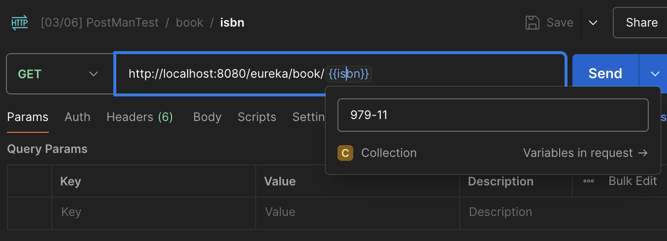 주의할 점은 파라미터를 중괄호 2개로 감싸고, 안에 밸류값으로 테스트할 isbn 문자열을 넣어줘야 합니다.