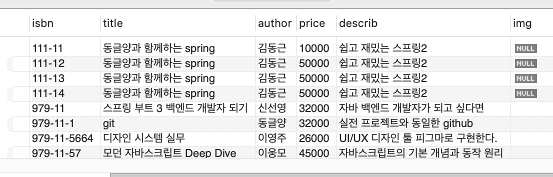 먼저 mysql 데이터베이스에서 확인한 book 테이블은 다음과 같습니다.