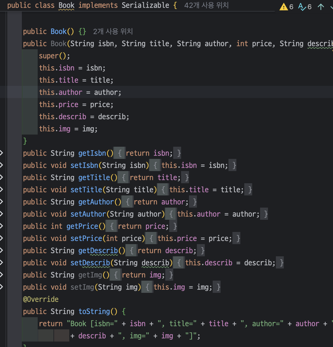 Book 객체와 데이터베이스의 필드에 대한 게터, 세터 함수를 정의했습니다.