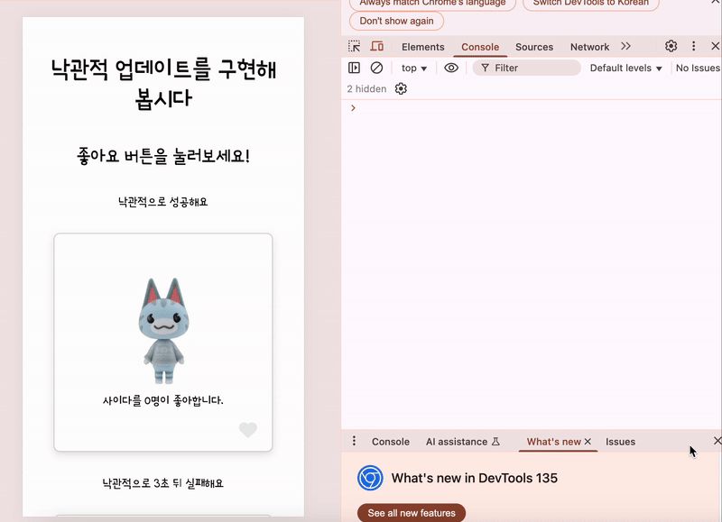 성공과 실패 카드를 각각 만들어, 낙관적 업데이트와 롤백 동작을 누구나 알기쉽게 테스트해볼 수 있습니다.