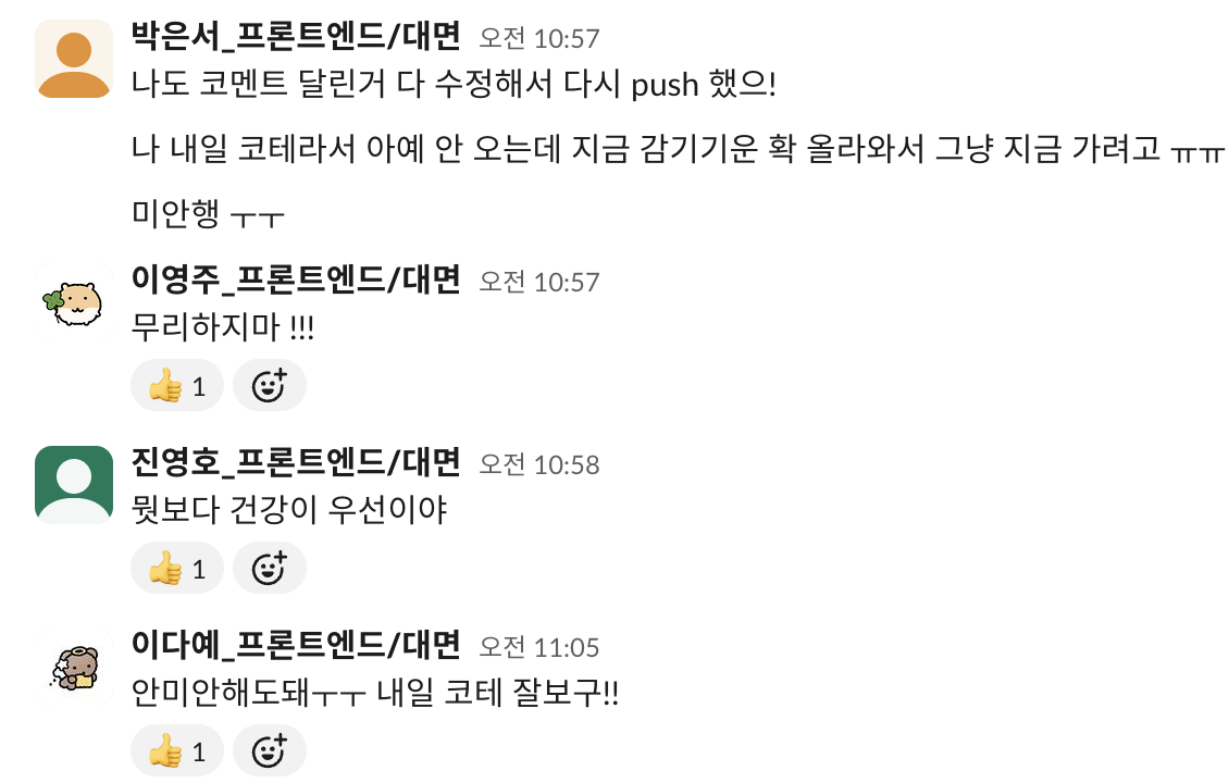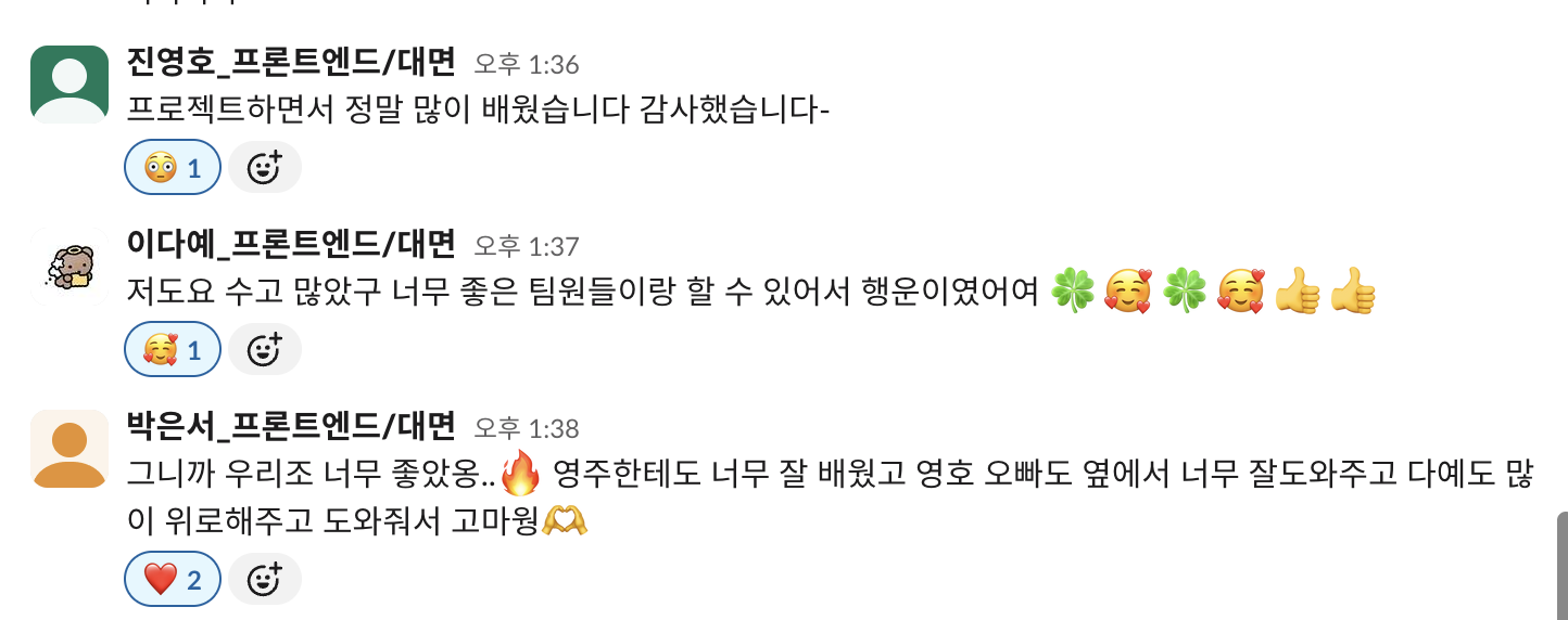 프로젝트 마지막 날, 모든 기능이 정상적으로 작동하는 것을 확인했을 때의 짜릿함은 아직도 생생합니다.특히 다들 처음엔 React가 너무 어려웠는데, 덕분에 실력이 많이 늘은 것 같다고 말해주어서 팀 리더로서 뿌듯함과 보람을 느꼈습니다. 매일 슬랙과 구두를 통한 적극적인 질문과 코드 리뷰, 서로를 배려하는 태도 덕분에 팀 전체가 함께 성장할 수 있었습니다. 좋은 사람들과 함께해서 재밌는 경험이었고 덕분에 오빠 언니들과 더욱 친해질 수 있었습니다. 진짜 미니 플젝 4조 안녕..🥹