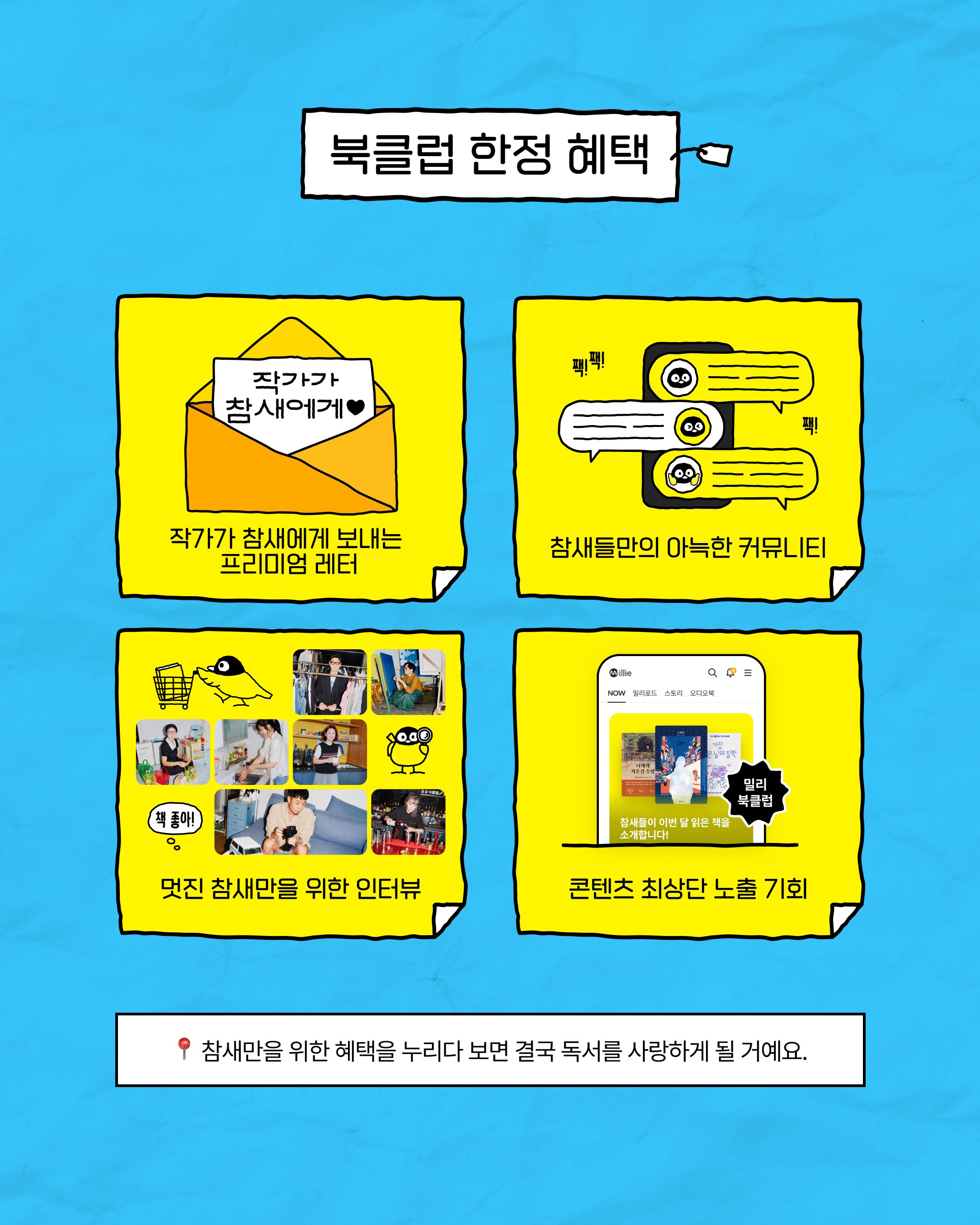 - 북클럽 전용 커뮤니티 활동 및 작가 편지, 우수 참여자 이벤트 등 풍성한 혜택