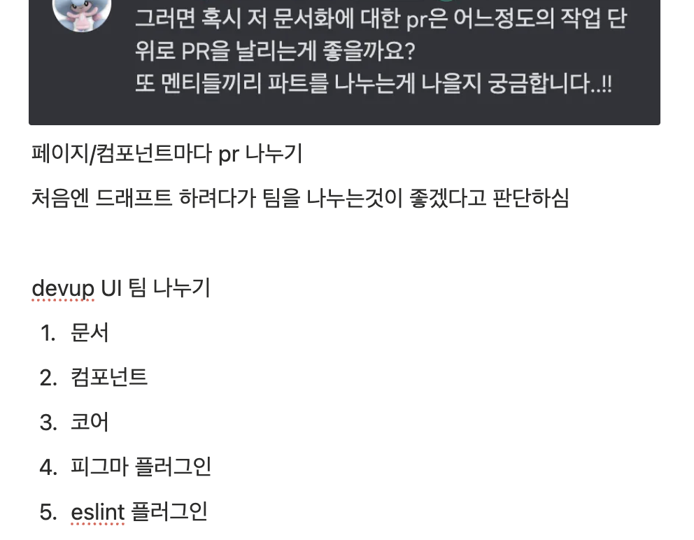 그래서 팀을 나누기로 제안했고, 첫번째 프로젝트인 Devup UI의 문서작성 팀에 합류하게 되었다.