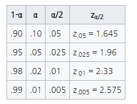 자주 쓰이는 값: z0.5=1.645, z.0.25 = 1.96, z.0.1 = 2.33, z.0.05 = 2.575
