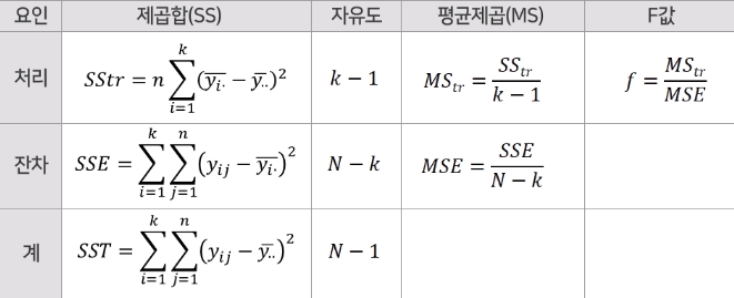 SSE(잔차제곱합) = SST(총제곱합) - SStr(처리제곱합)