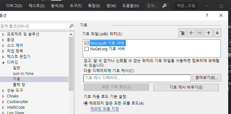 어제 백준 고양이 문제 풀 때도 발생한 오류창이었는데 개 문제 풀려니 또 생겼다. 어제는 복사 못했고 오늘 드디어함ㅋㅋ 구글링을 통해 알아낸 해결방법은 디버그창 옵션에 들어가서 Microsoft 기호 서버에 해제되어 있던 체크 표시를 활성화 해주는 거였음. 괜히 어제 말도 안되는 함수 인자니 포인터니 뭐니 서치했네 ㅠㅠ